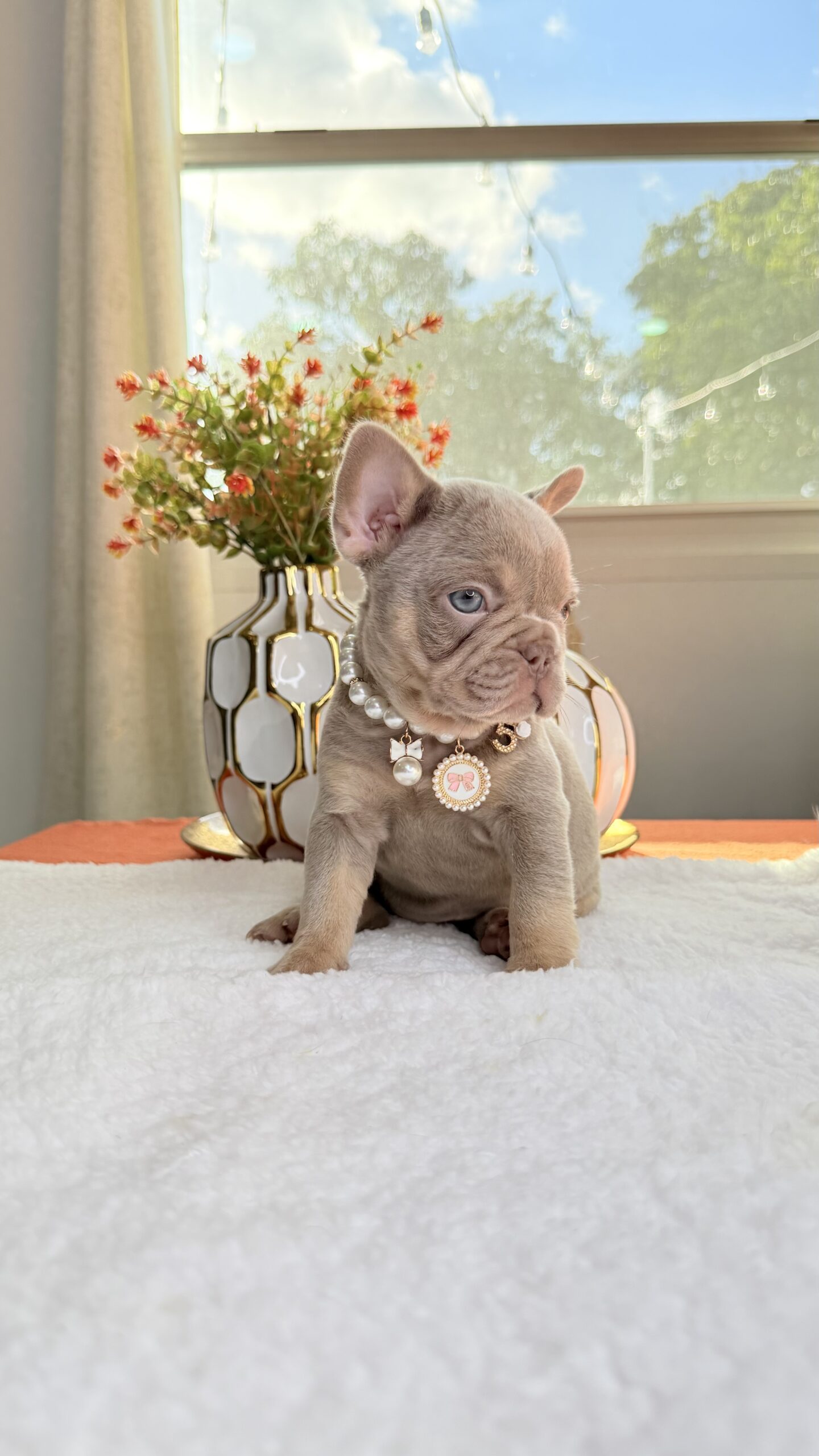 Luna is an adorable Isabella and tan fluffy carrier female French Bulldog puppy. She has a gentle temperament and a beautiful soft coat, perfect for families looking for a loving, well-bred companion. AKC registration available.